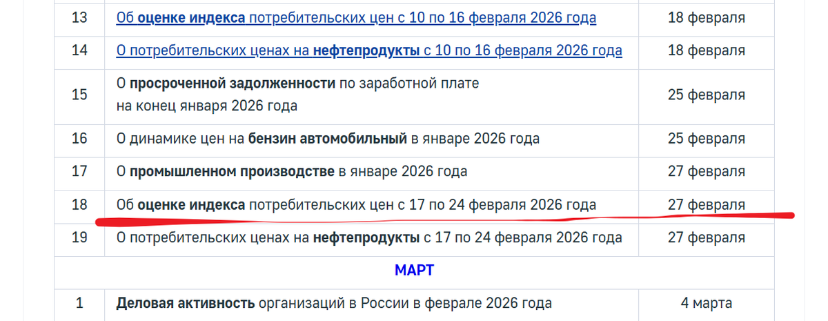 Сегодня традиционных данных по недельной инфляции не будет. Ждите пятницу. Там они будут за период с 17 по 24 февраля, т.е. на один день больше, чем обычные сводки. А значит, и цифры могут быть слегка повышенные.
