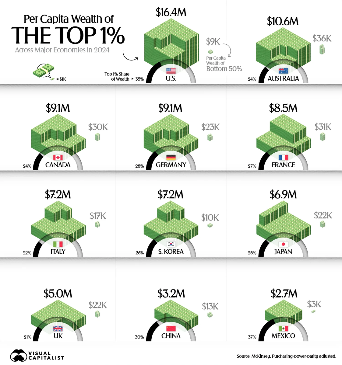Средний уровень благосостояние топ-1% населения в пересчете на 1 юнита из этого самого топа составляет 16,4 млн $, что намного опережает остальные «развитые» экономики. При этом благосостояние на ту же самую душу, только среди низших 50% слоёв, составляет 9 тыс.$.