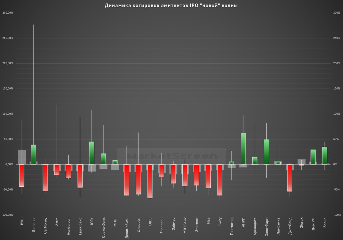IPO «новой» волны – это первичные размещения акций на отечественных биржах после начала СВО, т.е. после того, как сильно поменялась структура инвесторов. Ушли западные, пришли отечественные физические. С тех пор 27 компаний провели IPO. Текущие результаты на картинке.