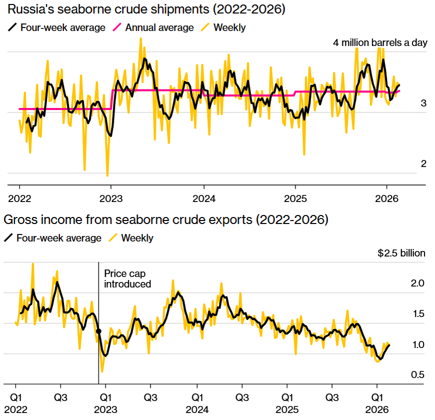 Тем не менее, 3,443 млн баррелей в сутки в среднем на прошлой неделе. 32 танкера. 1,141 млрд $ гешефта. такой расклад даёт нам породистый и неполживый Блоомберг.
