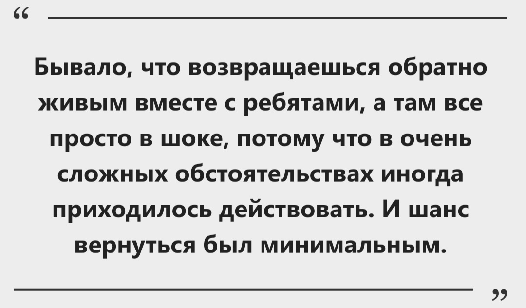 — Гибель гражданского населения, особенно детей. Враг же всегда прикрывается мирными, обстреливает их. Там ничего человеческого нет вообще. И вот это всё сложно через себя пропускать. Когда ты только помогал гражданским, приносил паёк, или воду, или ещё что-то, а потом из этого же дома ты спустя два часа достаёшь обгоревшие тела детей. Я пару раз чуть с ума не сошёл. Время лечит, конечно, но воспоминание остаётся, стоит перед глазами. И вот это самое тяжёлое.