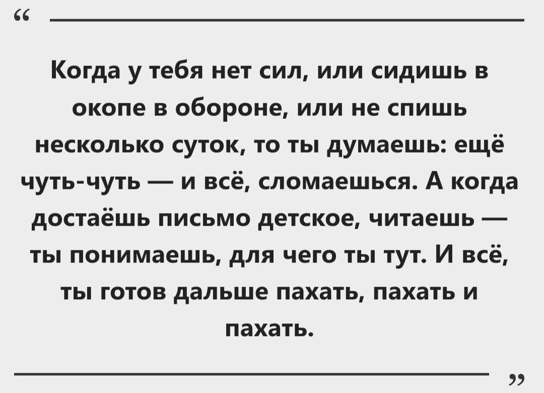 У меня даже с собой в файлике всегда три письма было. Я постоянно их носил около сердца. И в тяжёлый момент, когда руки опускались, просто доставал их и перечитывал. Потому что это про самое дорогое, что у нас есть.
