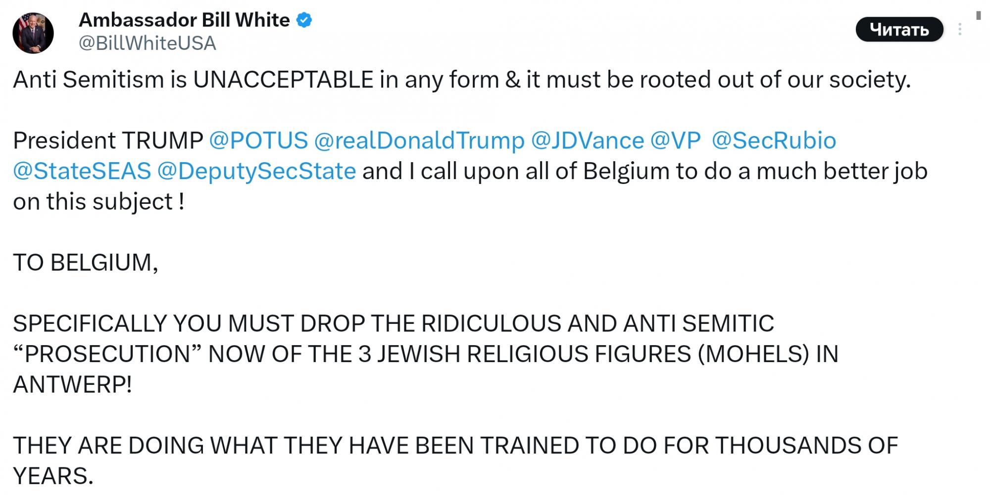 Посол США в Бельгии Билл Уайт подвергся критике за свой "трампистский" стиль общения в интернете. 16 февраля он опубликовал пост заглавными буквами с сомнительными знаками препинания, в котором потребовал от бельгийских властей «прекратить НЕЛЕПОЕ И АНТИСЕМИТСКОЕ “СУДЕБНОЕ ПРЕСЛЕДОВАНИЕ” против трех еврейских религиозных деятелей в Антверпене».