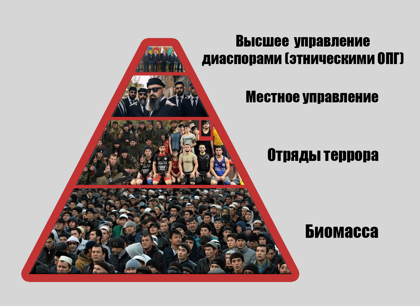 Начнём со схемы устройства национальных ОПГ. Почти все организации в мире существуют в пирамидальном или сетевом виде. Вид пирамиды в России имеют большинство (но не все) этнических ОПГ. Если упростить, то схему можно разделить на 4 блока. Они представлены на картине: биомасса, отряды террора, местное и высшее управление. Хоть эти блоки довольно просты для понимания, но всё же их специфика почти никем не объясняется. Этому и будет посвящена первая статья из цикла.