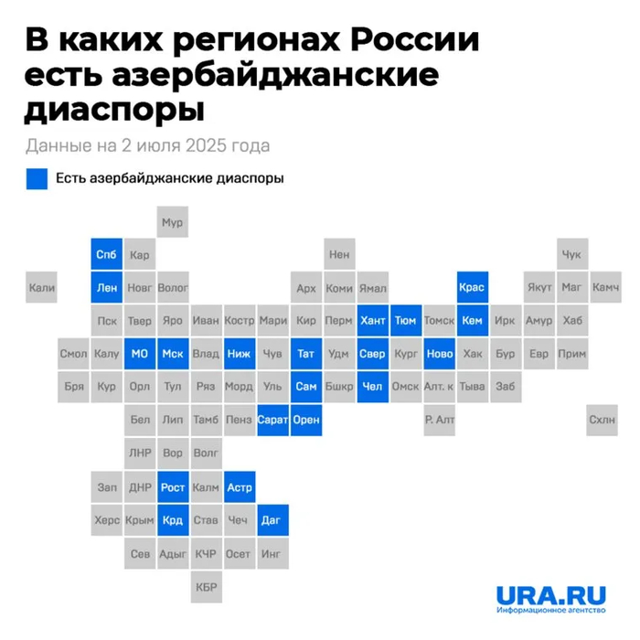 Было сказано, что будет акцент на азербайджанской диаспоре, поэтому далее в основном о ней. Она существуют в более чем 20 регионах России. А если быть точнее, то имеется единая мафиозная азербайджанская структура с 20+ метастазами на теле России.