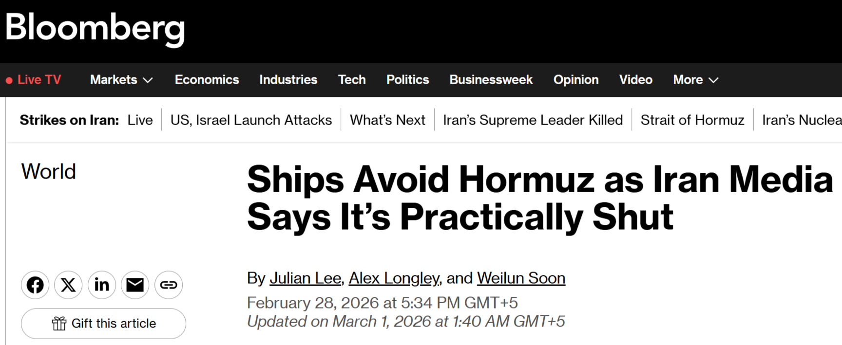 Bloomberg: Нефтяные перевозки в значительной степени приостановлены в Ормузском проливе, который соединяет богатый нефтью Персидский залив с открытым морем после того, как США и Израиль бомбили Иран, при этом иранские СМИ заявляют, что водный путь «практически закрыт».
