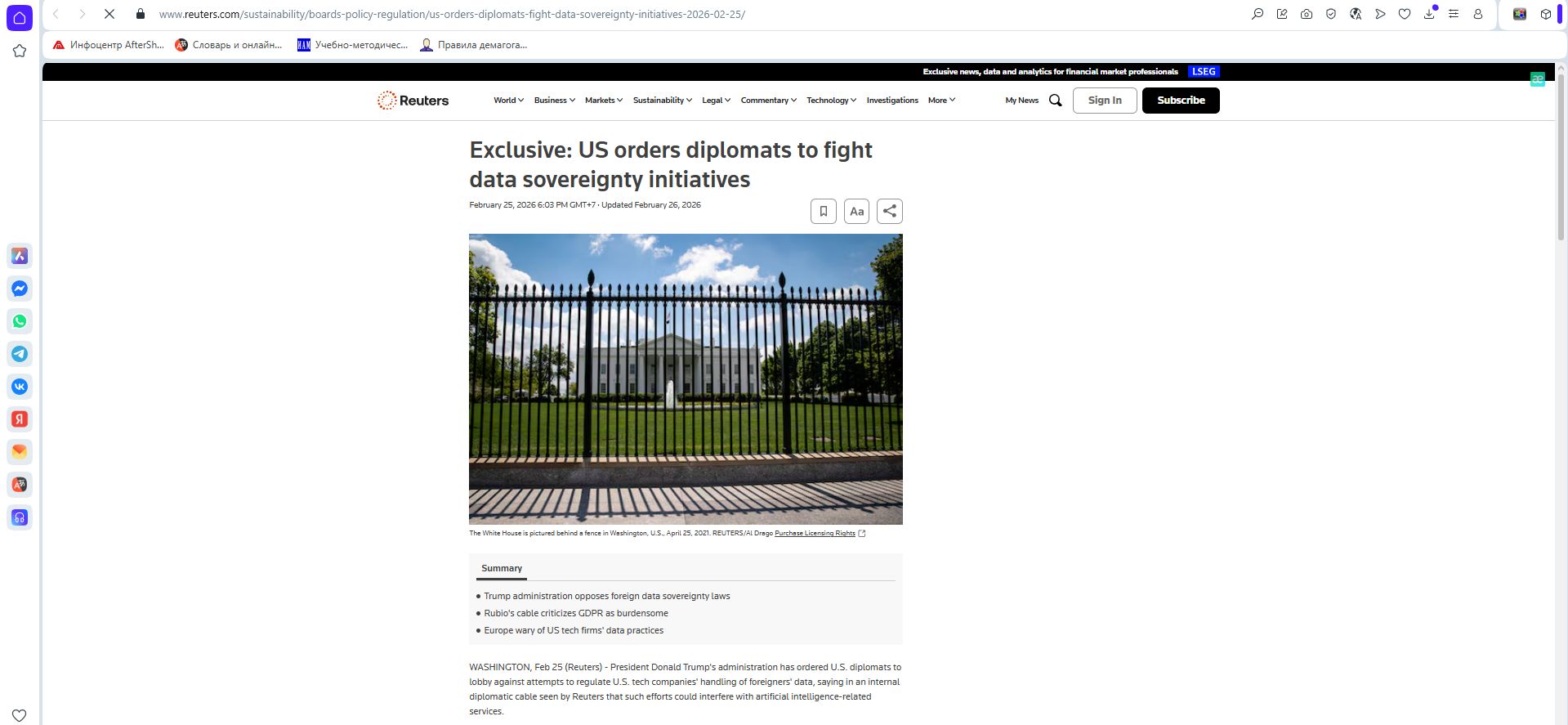 Телеграмма также поручает дипломатам отслеживать инициативы по ограничению трансграничной передачи данных и продвигать Global Cross-Border Privacy Rules Forum, созданный в 2022 году США и рядом партнёров для поддержки свободного обмена данными при наличии механизмов защиты приватности. Reuters отмечает, что шаг укладывается в серию действий против европейского регулирования цифровой сферы, включая прошлогодние призывы к дипломатам активнее спорить с законом ЕС о цифровых услугах и недавние планы США запустить онлайн-портал для обхода ограничений на публикации, которые в Европе считают недопустимыми.