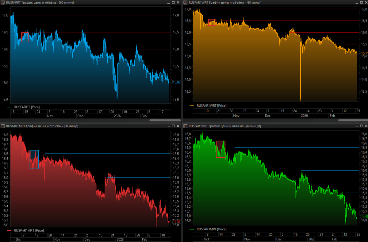 В том смысле, что мы перешагнули порог «меньше месяца» до очередного заседания Совета директоров Банка России по ключевой ставке, которое, напоминаю, состоится 20 марта. И в этот самый момент месячный RUSFAR пополз вниз. Т.е. на него начинают действовать расчёты тех, кто деньги дают/берут под залог ценных бумаг. И вот ставки поползли в районе 15%.