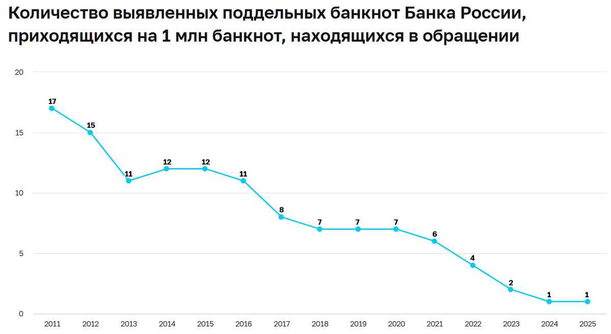 Наличный оборот всё сужается и сужается. Вместе с ним падает и число фальшивых банкнот. Тренд давний и устойчивый.