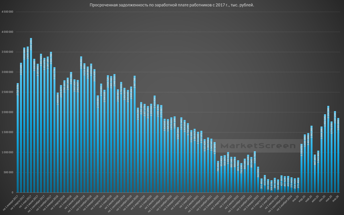 На конец января суммарная задолженность по заработной плате составила 1 855,9 млн ₽. Ну т.е. без малого 2 миллиарда. По сравнению с декабрём 2025 сумма сократилась на 171,3 млн ₽ или на 8,5%.