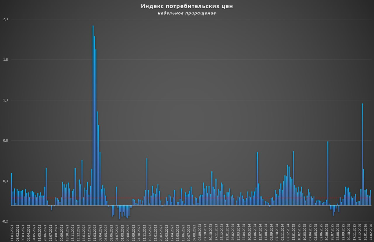 Инфляция в РФ с 17 по 24 февраля составила 0,19%, в годовом выражении замедлилась до 5,8%