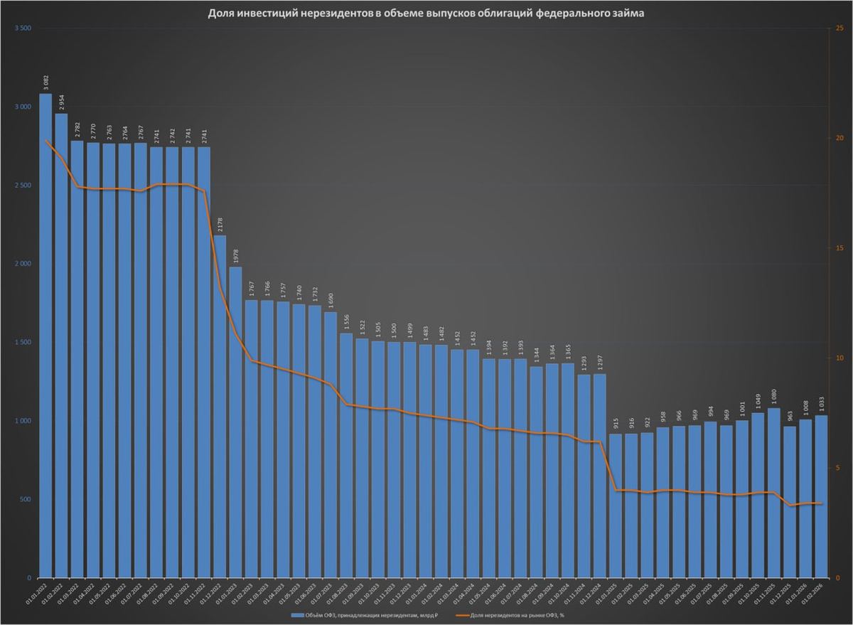 Нерезидентов нынче в долговых бумагах нашего Минфина в 3 раза меньше, чем на начало 2022 года. Пик же вложений был зафиксирован 1 октября 2021 года - 3 383 млрд ₽ и 21,6% доля.