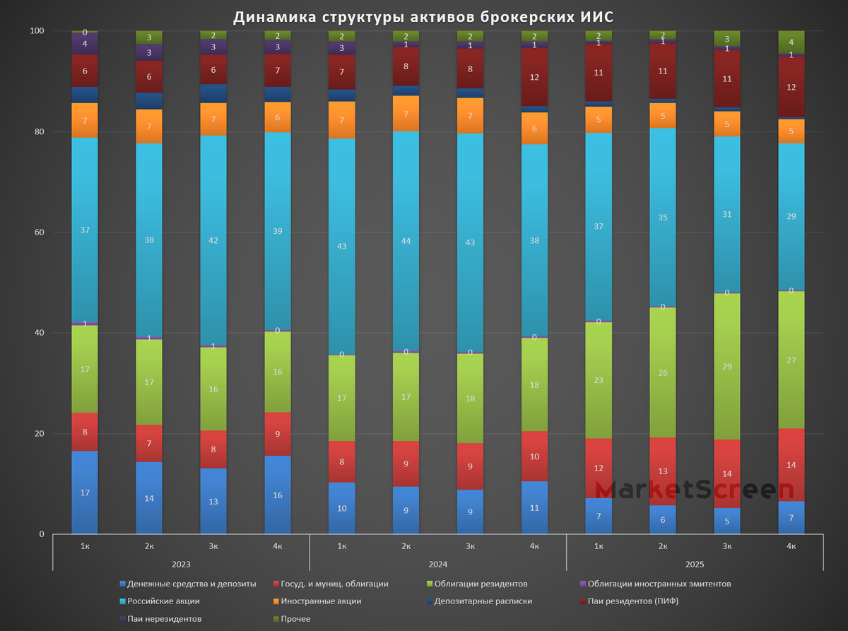 Обратите внимание на динамику структуры. Значительно растёт доля облигаций. Как корпоративных, так и государственных и муниципальных. На фоне снижения ключевой ставки повышается интерес к рублевыми облигациям. За год доля российских облигаций в портфелях на ИИС увеличилась с 28 до 42%. Канал MarketScreen, несомненно, прикладывает свою руку к этому движению.