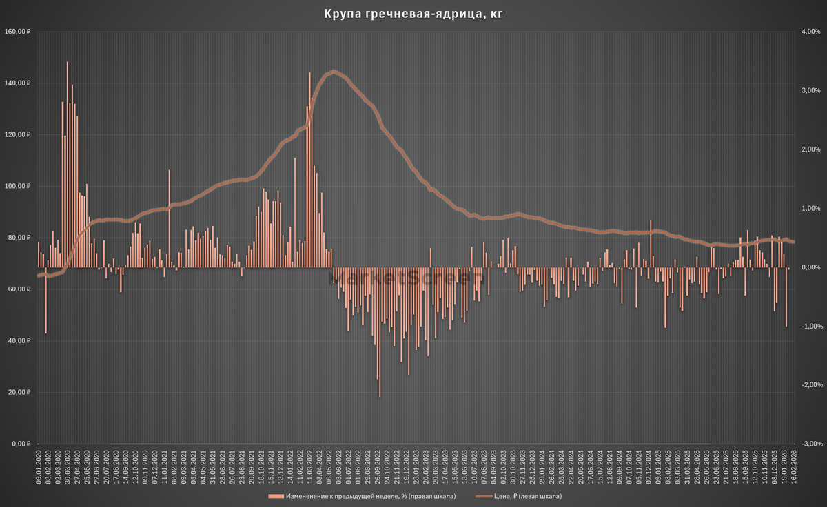 Росстат даёт на историю средних недельных цен с начала 2020 года. За этот период крупа гречневая-ядрица выросла с 65,3 до 78,44 рублей за кг. Или на 20,12%.
