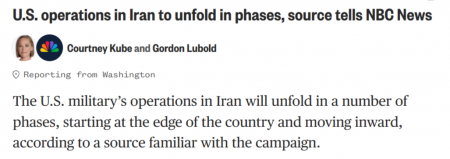 NBC News: Согласно источнику, знакомому с ходом кампании, военные операции США в Иране будут проходить в несколько этапов, начиная с окраины страны и продвигаясь вглубь.