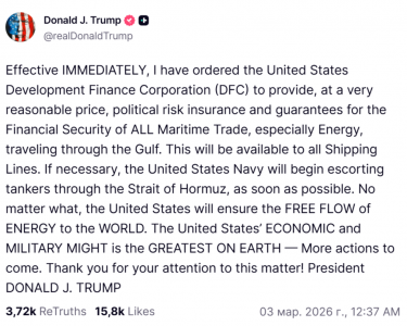 Это будет доступно всем судоходным компаниям. При необходимости ВМС США начнут сопровождение танкеров через Ормузский пролив как можно скорее. Во что бы то ни стало, Соединенные Штаты обеспечат СВОБОДНЫЙ ПОТОК ЭНЕРГИИ В МИР. Экономическая и военная мощь Соединенных Штатов — величайшая на Земле. — Дальнейшие действия последуют. Благодарю за ваше внимание к этому вопросу! Президент Дональд Дж. Трамп