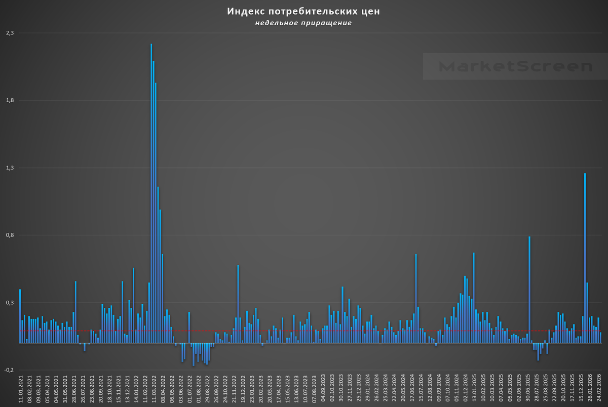 Обращаю внимание на уточнения в скобочках. В этот раз недельную инфляцию посчитали за 6 дней. Но даже так результат неплох. Напоминаю, что для годовой цели в 4-4,5% недельная инфляция должна быть в диапазоне 0,08-0,09%.