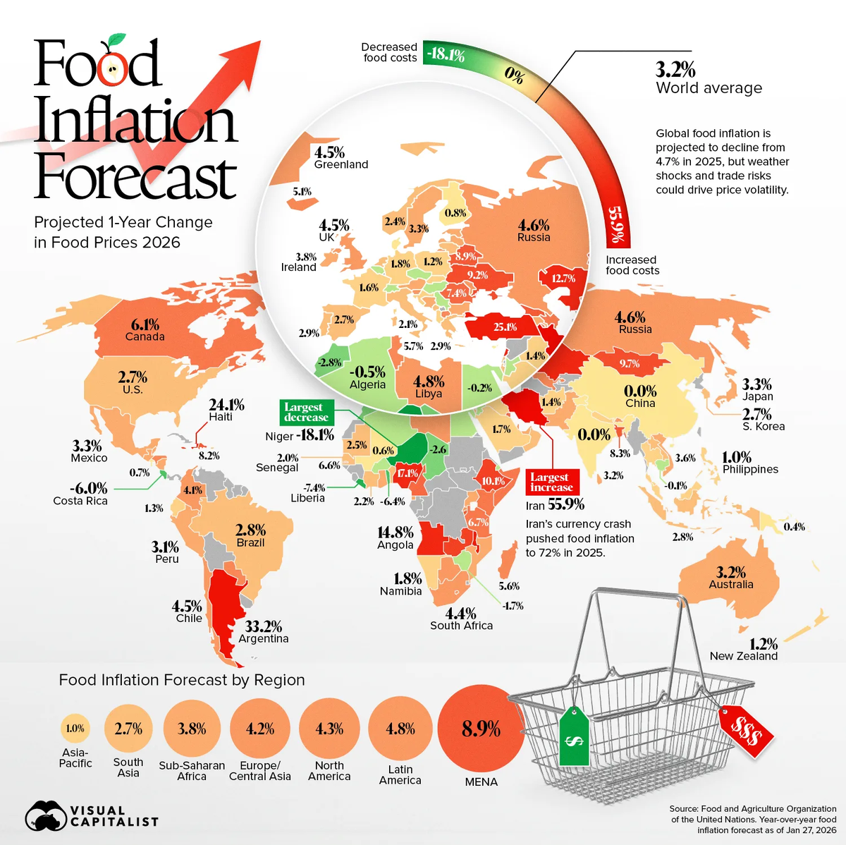 Значит, по последним расчётам Продовольственной и сельскохозяйственной организации ООН в 2026, нас (весь мир) ждут вот такие показатели продовольственной инфляции. От снижения на 18,1% (в Нигере) до роста на 55,9% (в Иране). В целом же по миру рост цен на продукты составит 3,2%.