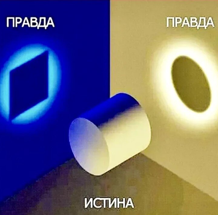 Это - уже заезженная картинка, показывающая разницу между Правдой и Истиной; одно переходит в другое с помощью описываемого выше стремления к Истине. Если мы хотим по проекциям выяснить общую картину, это приведёт нас к одному результату. А вот если наша цель - убедить, что только наша проекция является Истиной, а все остальные - ересь и анафема, то и результат будет другим.