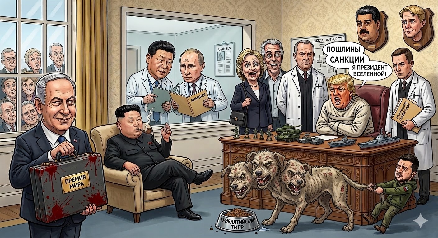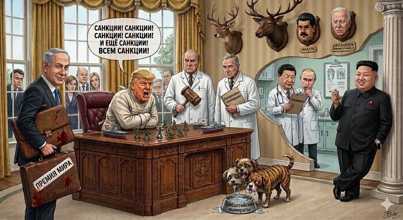 Вот Трамп в смирительной рубашке в овальном за столом гавкает "санкции" и прочее, по бокам санитары в виде судей, тех что пошлины отменили и ещё кто-нибудь, внизу из миски хавает трёхголовая болонка-трибалтийский тигр, с клыков капает слюна, в разрезе через стенку стоят доктора с лицами Си и Пу, изучая историю болезни с озабоченными лицами. Можно ещё рядом для контраста нарисовать Кима на расслабоне.