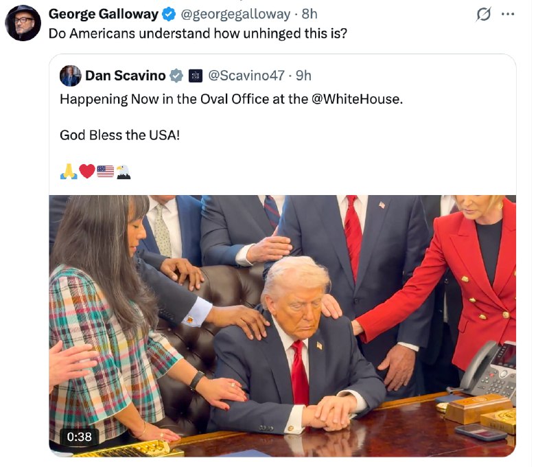Они собрались, чтобы обратиться к богу с просьбой о «ниспослании силы» президенту США Дональду Трампу. Видеозапись была опубликована замглавы администрации Дэном Скавино.