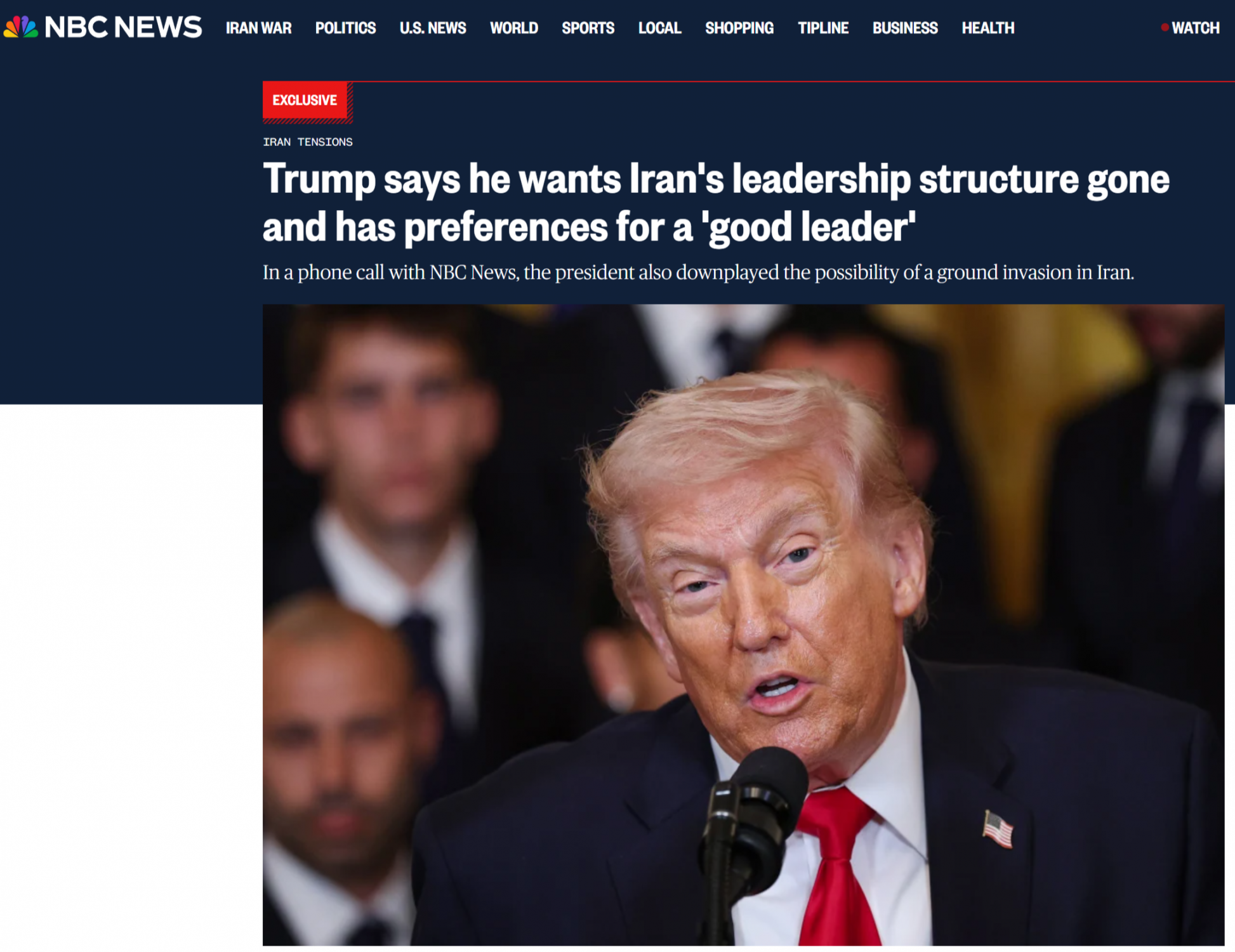 Комментарии Трампа развивают мысль, высказанную им в интервью телеканалу NBC News в субботу. На вопрос о том, кто возглавит Иран в будущем, Трамп ответил: «Я не знаю, но в какой-то момент мне позвонят и спросят, кого бы я хотел видеть на этом посту», добавив, что он «лишь немного саркастичен, когда это говорит».