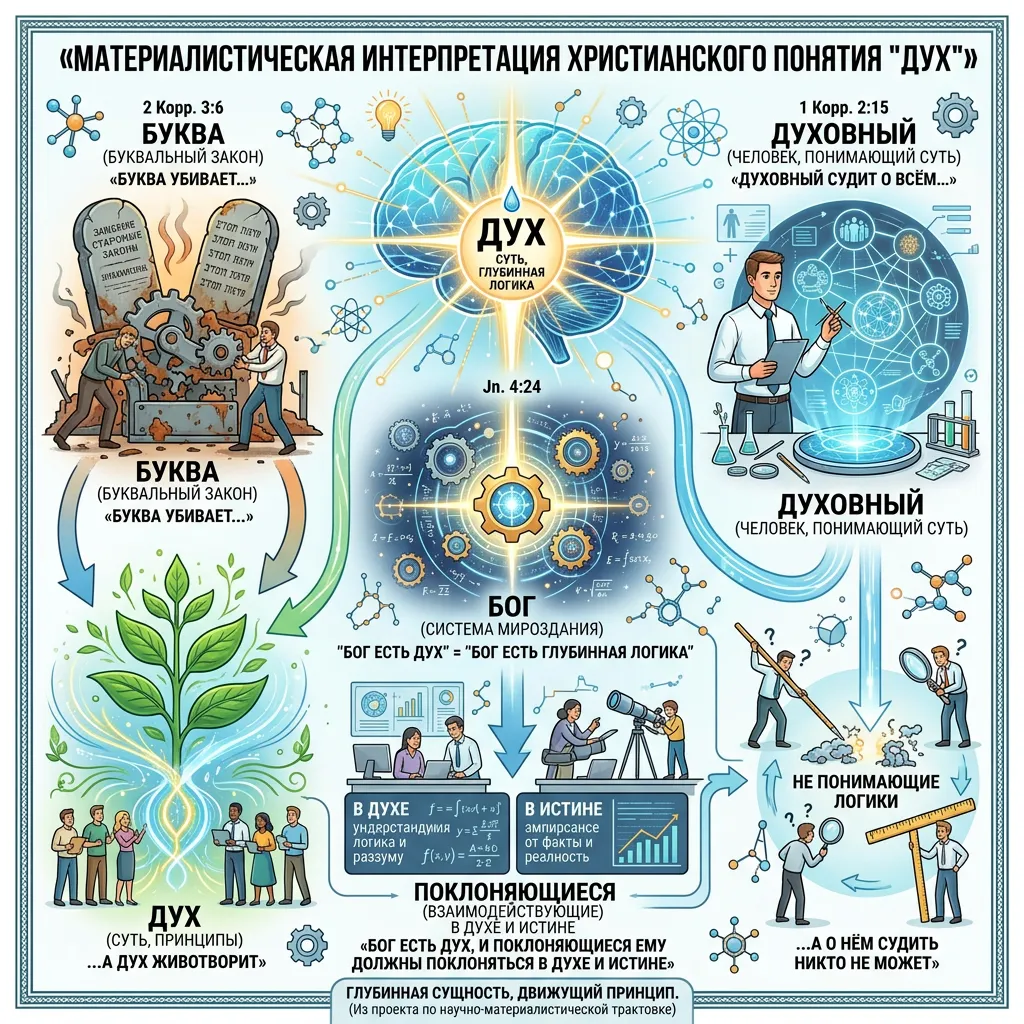 Три языка, три культуры, тысячи лет — и одна семантика. Дух — это не вещество и не существо. Дух — это то, что делает форму живой. Суть, которая стоит за поверхностью. Смысл, который оживляет конструкцию. Глубинная логика, без которой структура мертва. Ровно то, что мы обнаружили в словосочетании «дух закона», — но масштабированное на всю реальность.