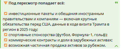 Кроме того, необходимо помнить, что пересмотр инвестиций напрямую угрожает масштабным контрактам, заключенным во время ближневосточного турне Дональда Трампа в мае 2025 года. Отказ от обещанных Саудовской Аравией и ОАЭ пакетов сорвет создание тысяч рабочих мест в американской энергетике и строительстве дата-центров. Для действующей администрации это обернется серьезным политическим ущербом, так как эти инвестиции подавались как крупная экономическая победа.