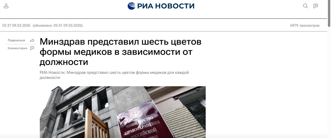 Минздрав России представил шесть рекомендованных цветов формы медработников в зависимости от их должности, следует из документа, с которым ознакомилось РИА Новости.
