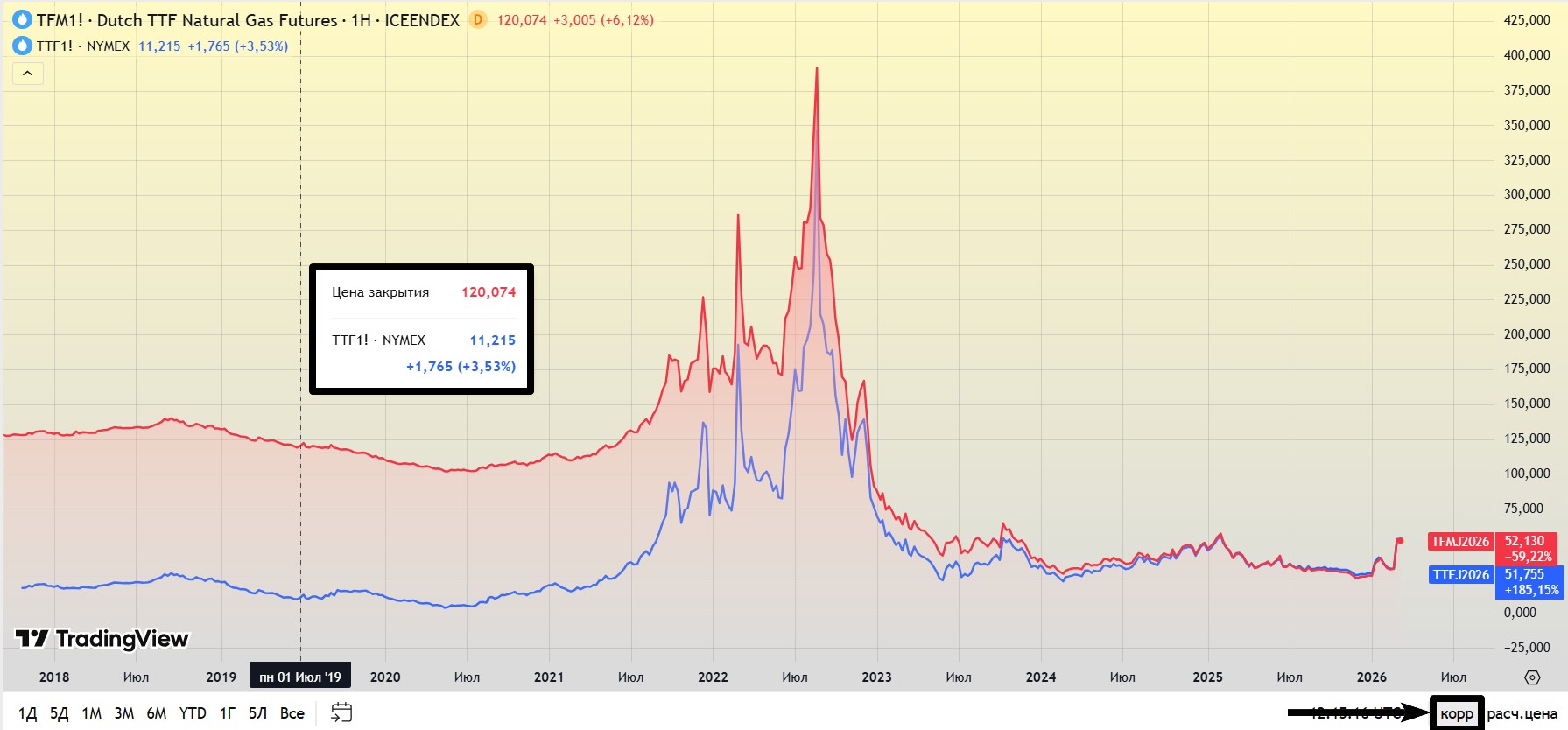 Ранее было почти невозможно проводить такое сравнение, поскольку Нью-Йорк считал в долларах и в термальных единицах. Пересчет приходилось делать вручную, а сведение графиков получалось, мягко говоря, некорректным с визуальной точки зрения даже при процентном сравнении изменений или логарифмировании. Но теперь это изменилось и есть как минимум часть графиков, величины которых идентичны. Как можно убедиться на скрине выше, теперь обе кривые синхронны, по крайней мере, для привычной всем расчетной цены закрытия (едва заметные отклонения от строгой зеркальности не учитываем).