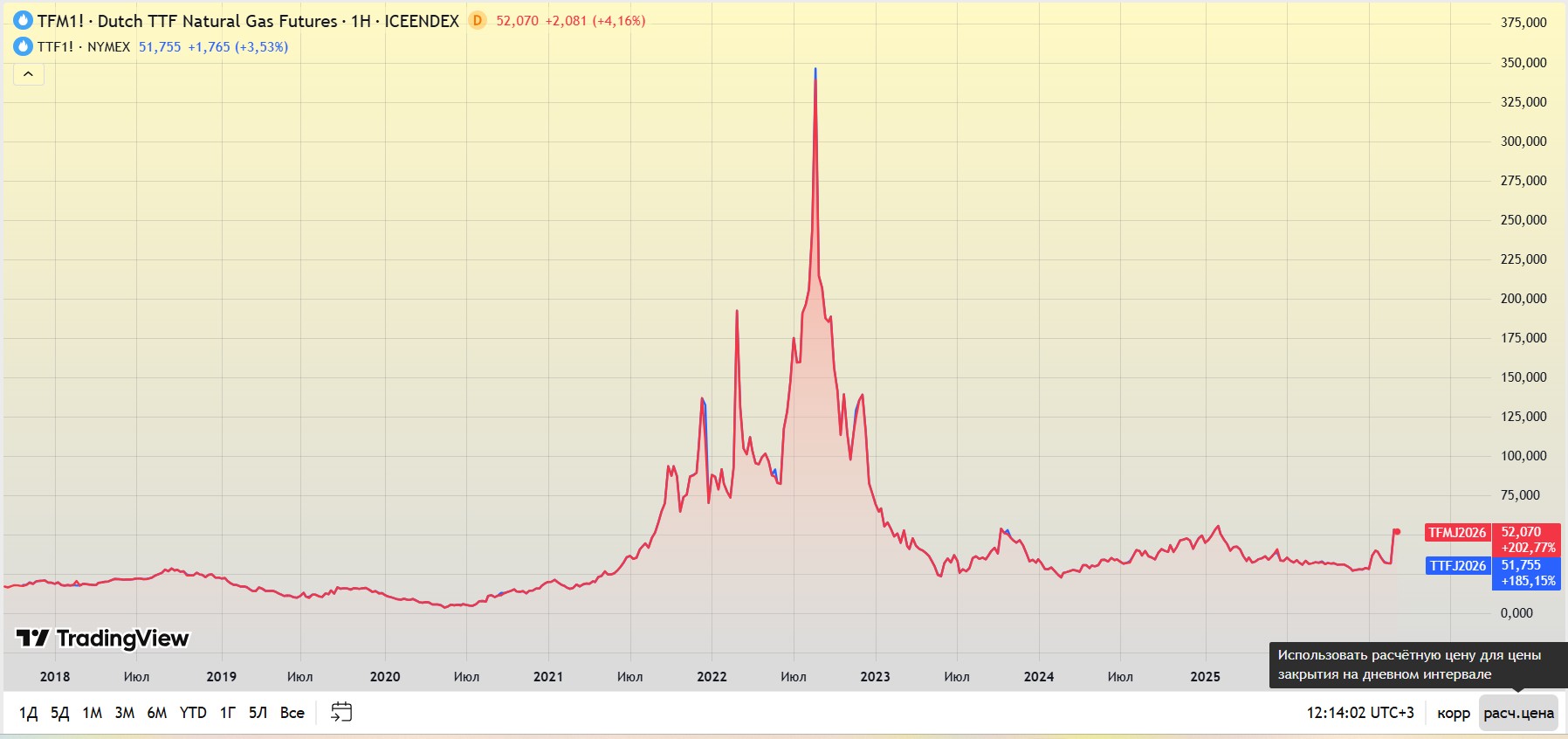В сети ходит несколько версий, не буду ни одну из них разбирать, а просто предложу небольшое новое наблюдение, которое вскрылось при изменении настроек на привычном сайте. И сперва понятный для большинства скрин с небольшим пояснением. Ниже - газовые фьючерсы голландской TTF с двух ведущих площадок: Лондонской ICE и Нью-Йоркской NYMEX. Цена на обоих графиках в Евро за Мегаватт. Элементарный для понимания график по всем показателям.
