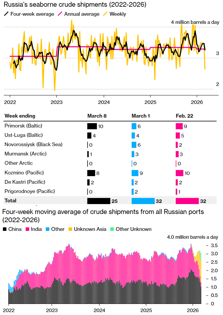 В общем, на прошлой неделе отгрузки упали до 2,641 млн баррелей в сутки. Говорят, это связано с недельной приостановки отгрузок с нефтяного терминала «Шесхарис» в Новороссийске на Черном море после атаки украинских беспилотников в ночь с 1 на 2 марта. Поставки возобновились в выходные, но, понятно, недельную статистику изменить не смогли.