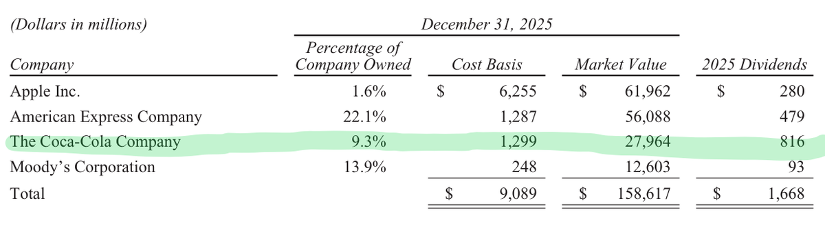 Согласно последнему годовому отчёту известной в узких кругах компании Berkshire Hathaway Inc, одним из основных вложений в ценные бумаги являются акции компании Кока-Кола. Дедушка Баффетт закупался в 1988. Средневзвешенная цена покупок составляет 1 299 млн $ (т.е. 1,299 млрд $). Рыночная стоимость пакета на 31 декабря 2025 пакета равнялась 27,964 млрд $.