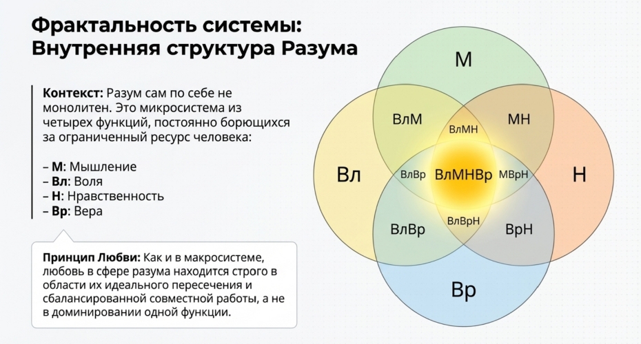 Ничего хорошего не сулит человечеству новая эпоха доминирования одной части разума над остальными. И как бы это пафосно не звучало, но спасение человечества в любви, о природе которой я писал тут(аудиоверсия от ИИ). В контексте поиска любви во взаимоотношении разумных начал человека, стоит рассмотреть диаграмму: