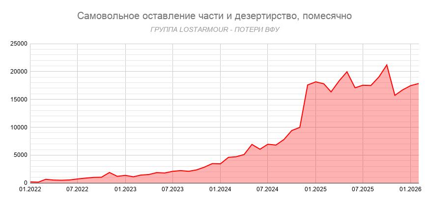 Появилась свежая статистика самовольного оставления части и дезертирства из украинской армии. Напомню, что раньше, до декабря 2025 года, прокуратура Украины вообще официально публиковала данные обо всех уголовных делах у себя на сайте в эксельке, и зоркие глаза российских осинтеров заметили, что среди прочего там публикуются статьи СЗЧ (СОЧ по-русски, то есть самовольное оставление части) и дезертирство. Если сложить эти две статьи, то мы узнаем, сколько уголовок на беглецов заводилось.