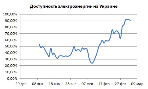 Декабрьские удары сократили потребление до 50%. Мощные январские, плюс морозы - до трети. Тем не менее, уже через неделю значение вернулось к 45%. Вывод из строя подстанций, распределяющих энергию АЭС в первой декаде февраля сбросил показатель до четверти потребного. Однако через пару недель доступность не только восстановилась, но и вышла на 60%. Наконец, к марту всё ушло к 90% - при том, что удары по энергетике периодически продолжают наносится..