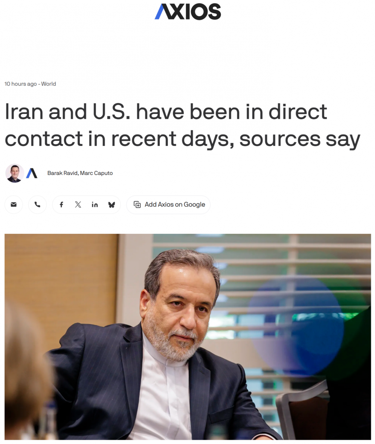 Axios: По информации американского чиновника и источника, знакомого с ситуацией, в последние дни был возобновлен прямой канал связи между посланником США Стивом Уиткоффом и министром иностранных дел Ирана Аббасом Арагчи.