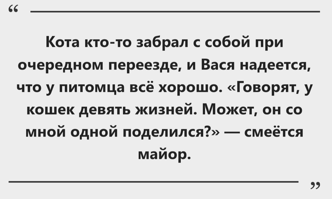 Некоторые эпизоды своей боевой биографии Вася уже и забыл. «Память меня после всех этих контузий начинает подводить. У меня много личных вещей за время войны сгорело, в том числе телефоны, где у меня были и видео, и заметки. А так у меня очень много фотографий было, даже с котом», — рассказывает Врата. В блиндажах военных часто живут кошки, и к ним привязываются так же, как и к домашним питомцам на гражданке. Может, и больше, так как все эти хвостики напоминают об уюте, оставленном далеко позади. Неудивительно, что Вася горюет об утрате снимков с котом.
