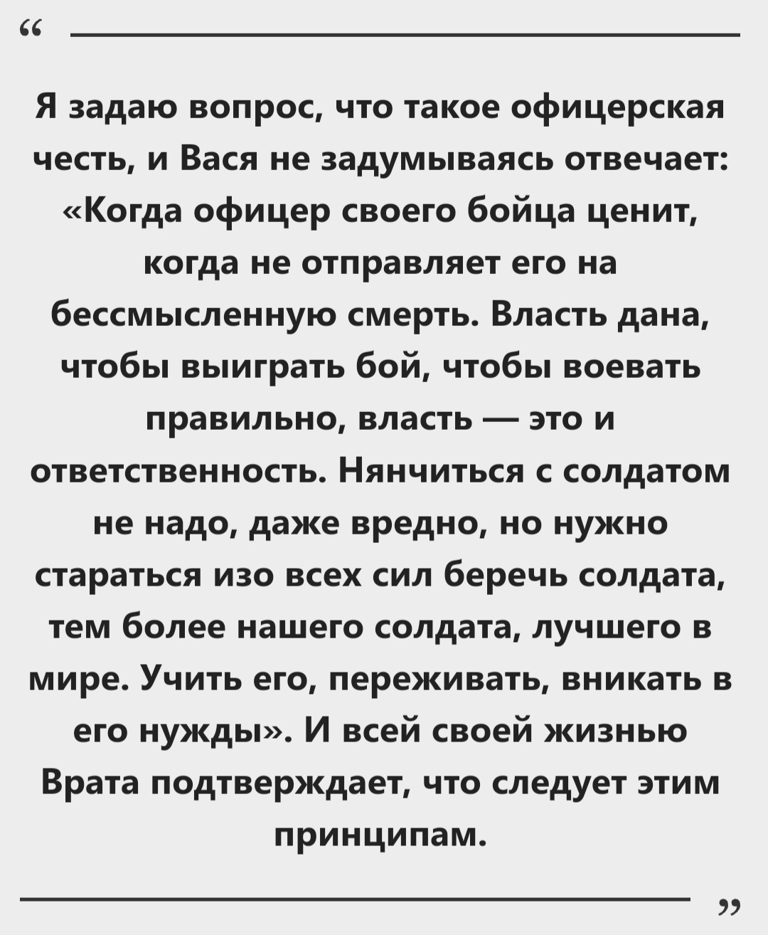 Я спрашиваю: неужели некому было, кроме замкомбата, проверять передний край? Врата пожимает плечами: «А для того чтобы построить картину, необходимо лично пройти всё ногами. Посмотреть самому командирским взглядом: вот здесь, например, дерево, здесь можно поставить пулемёты, а там — высота. Там можно посадить снайпера. Здесь низина, здесь можно поставить АГС. Вообще понимать, как в реальности дела обстоят. Прийти в блиндаж подчинённого, посмотреть, правильно ли он его откопал. Да и просто солдат должен видеть тебя, чтобы он знал, что есть контроль, есть офицер, который за него переживает».