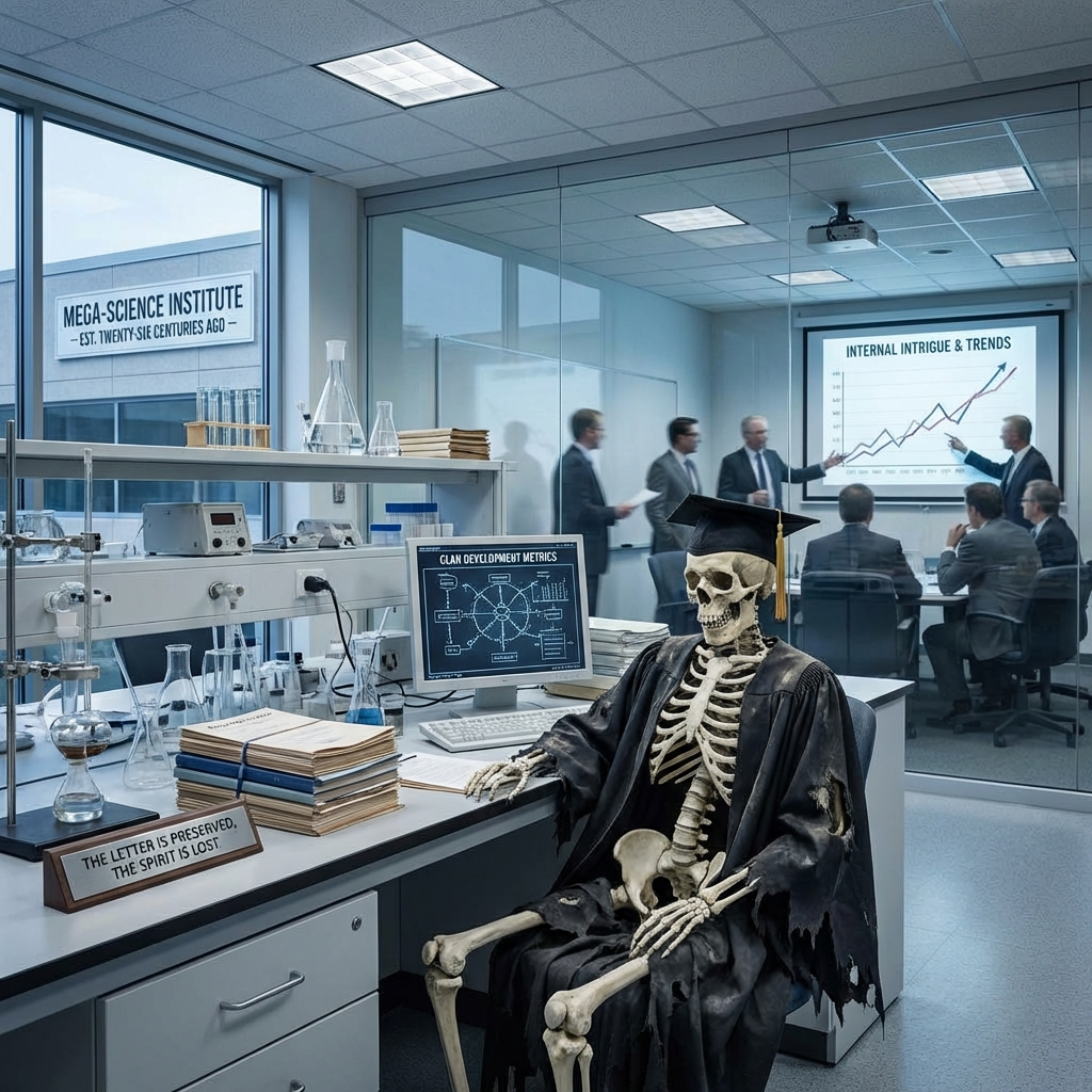 3. Подмена цели. Институт начинает обслуживать себя. Hrrgugd описывает это с хирургической точностью: «В клане все заточены на развитие клана и внутренние интриги. Работа и физика там это некоторый фон. Самое главное — быть в тренде и при возможности обойти/утопить кого-нибудь». Грант перестаёт быть средством исследования — исследование становится средством получения гранта. Форма и функция меняются местами.