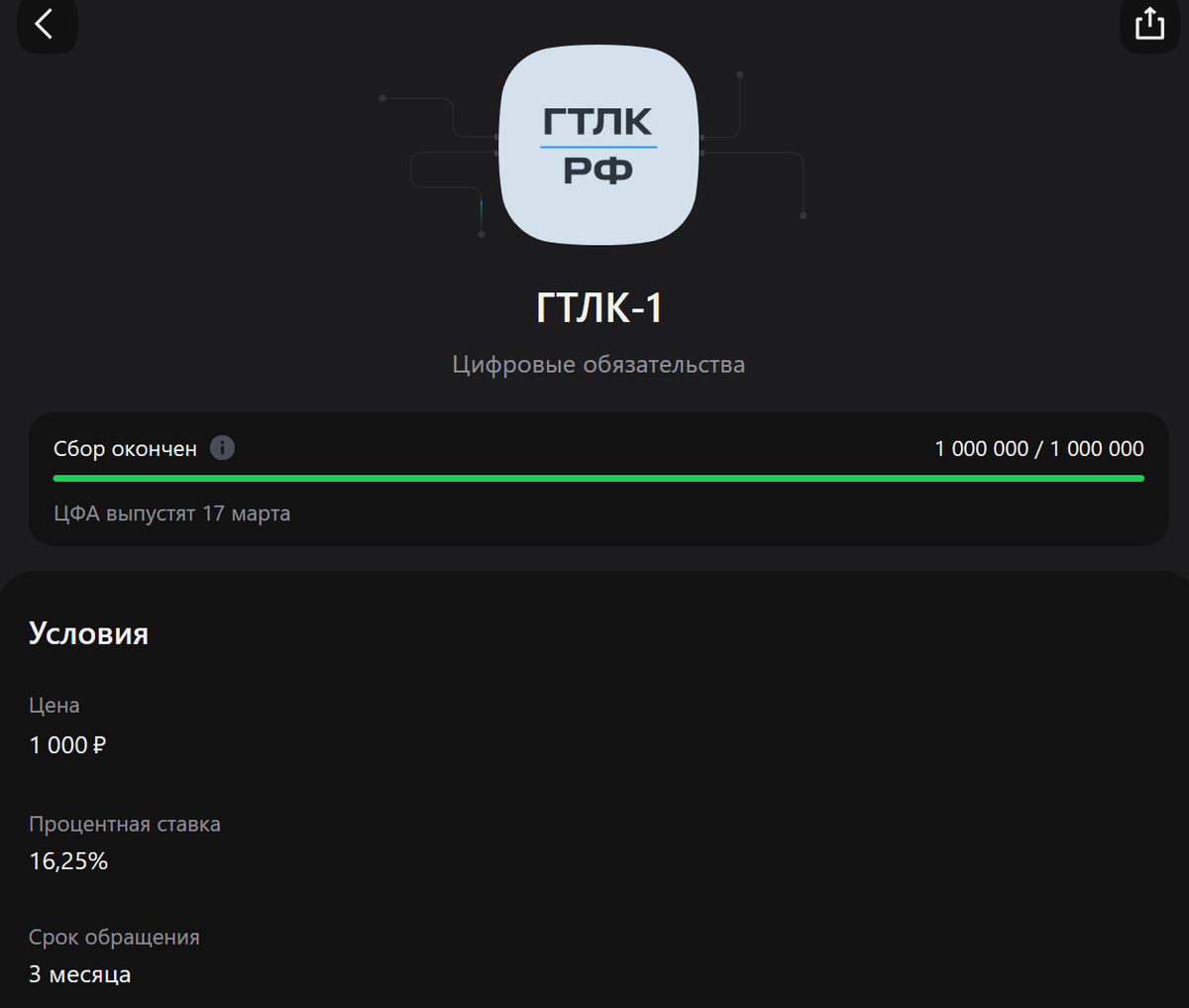 Хоп, и вот уже окончен сбор на 3-месячный ЦФА от АО «ГТЛК» на платформе Альфа-Банка. 16,25% от подобной конторы на дороге не валяются. Посмотрим, будут ли они на вторичке. И что с ликвидностью.