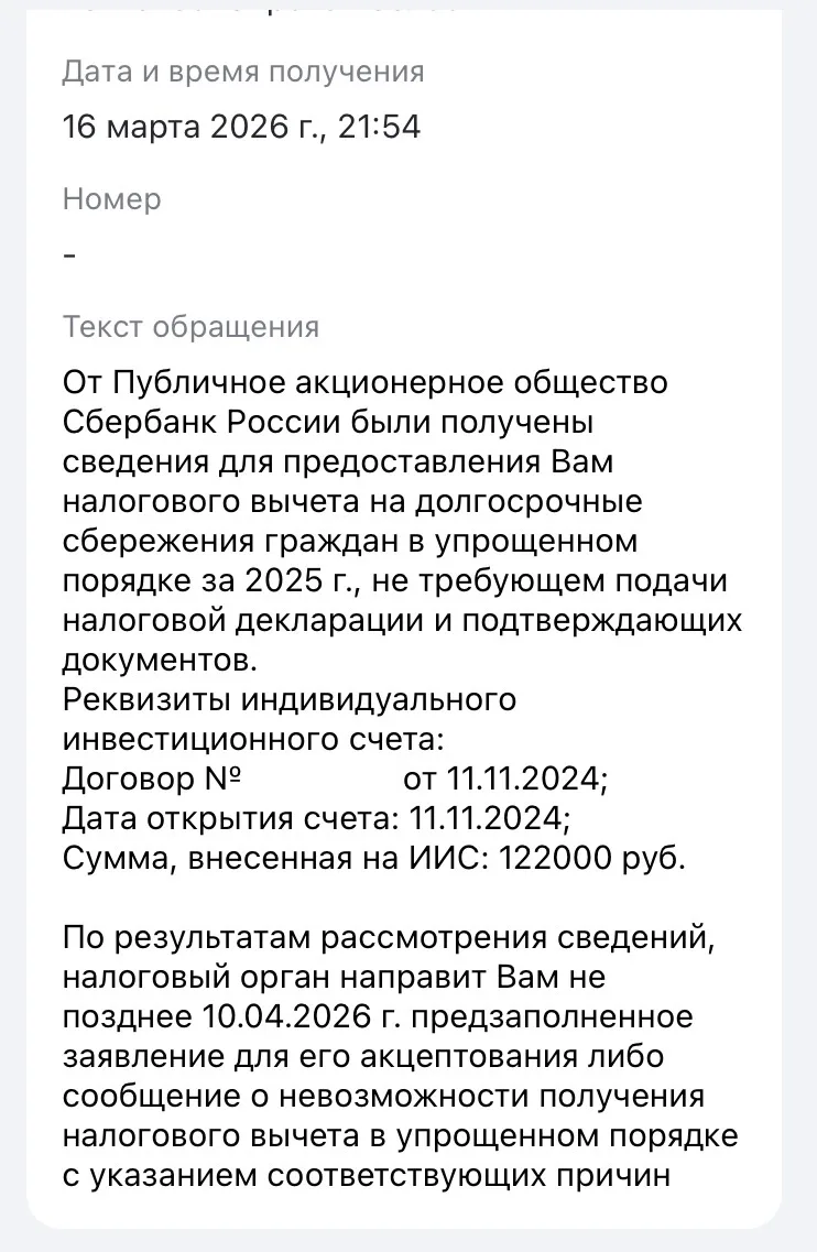 ИИС-3 я открыл в Сбере. Чтобы получить налоговый вычет со взносов, брокер сперва должен данную информацию отправить в ФНС. И вот вчера пришло от ФНС извещение. Дескать, мы всё получили, вам ничего делать не надо, скоро вам придет заявление, подпишите и получите деньги.