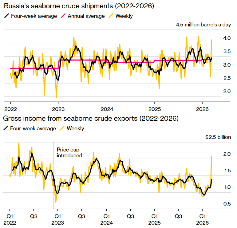 Более того, она и отгружать снова вагонами начала. Так, за прошлую неделю в среднем в день уходило морским путём 4,112 млн баррелей в сутки. Это четвёртый результат с начала 2022 года.