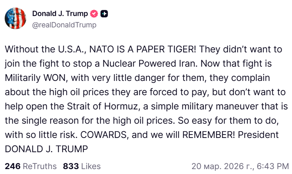 Без США НАТО - ЭТО БУМАЖНЫЙ ТИГР! Они не захотели присоединиться к борьбе за то, чтобы остановить ядерный Иран. Теперь, когда война выиграна военным путем и для них почти ничего не угрожает, они жалуются на высокие цены на нефть, которые они вынуждены платить, но не хотят способствовать открытию Ормузского пролива - простого военного маневра, который является единственной причиной высоких цен на нефть. Для них это так просто и с таким небольшим риском. ТРУСЫ, и мы будем ПОМНИТЬ! Президент ДОНАЛЬД Дж. ТРАМП
