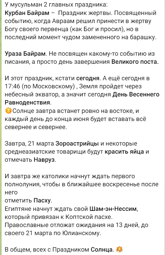 Я, русский крещёный агностик, поздравляю мусульман со светлым праздником Ураза Байрам! Желаю мирного неба над головой, любви и благополучия. Пусть Всевышний укрепит веру в сердце и душе, а также направит на праведный путь. Пусть услышит и примет все ваши молитвы!
