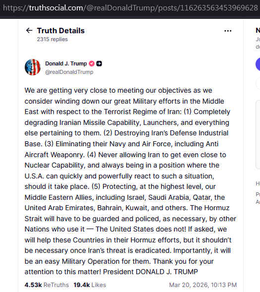 Ормузский пролив должен будет охраняться и контролироваться, по мере необходимости, другими странами, которые его используют — Соединенные Штаты этого не делают! Если нас попросят, мы поможем этим странам в их усилиях по Ормузскому проливу, но это не должно быть необходимым после устранения угрозы со стороны Ирана. Важно отметить, что для них это будет несложная военная операция. Благодарим вас за внимание к этому вопросу!"