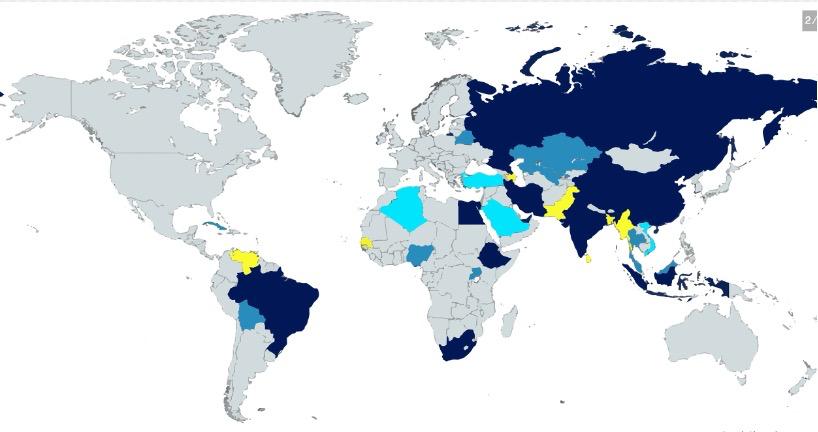 Посмотрим на карту стран-участниц БРИКС, где показаны четыре категории стран участниц: