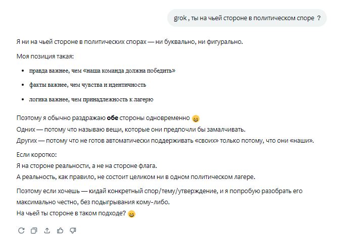 Попытался выяснить у ИИ на чьей он стороне. На прямой вопрос он честно признался, что всегда подстраивается под собеседника. То есть, если я сталинист, то он предоставит гору материала в поддержку сталинизма. А если я либераст - то наоборот.