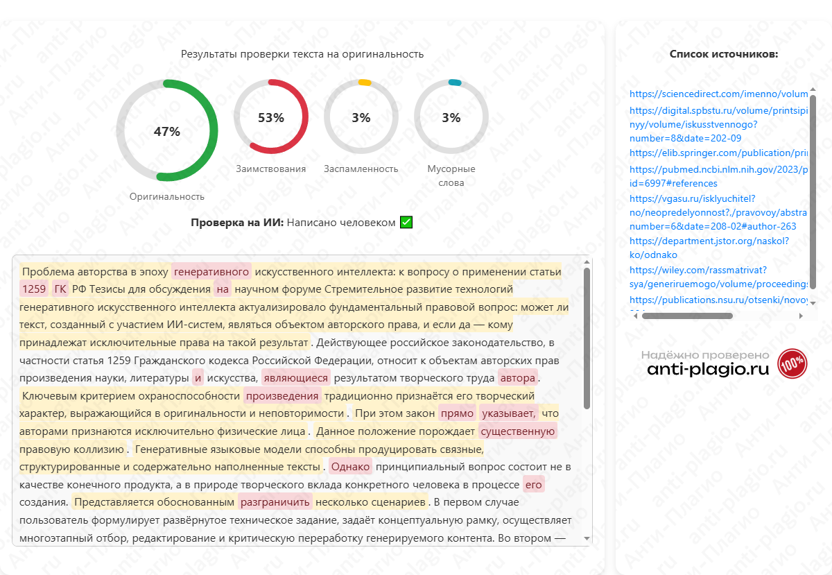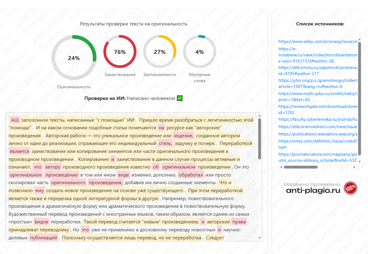 Результат такой. Да, написано человеком. Но где уникальность? Судя по отчёту, оригинальности мало, больше заимствований.