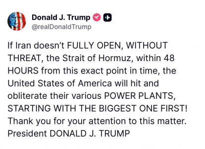 Если Иран не откроет Ормузский пролив полностью и без угрозы в течение 48 часов с этого момента, Соединенные Штаты Америки нанесут удар и уничтожат их многочисленные электростанции, НАЧНЕМ С САМОЙ БОЛЬШОЙ ДЛЯ НАЧАЛА!